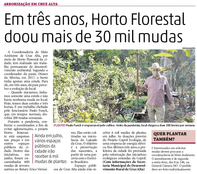 "Em três anos, Horto Florestal doou mais de 30 mil mudas" - Diário de Santa Maria, 02/07/2020.