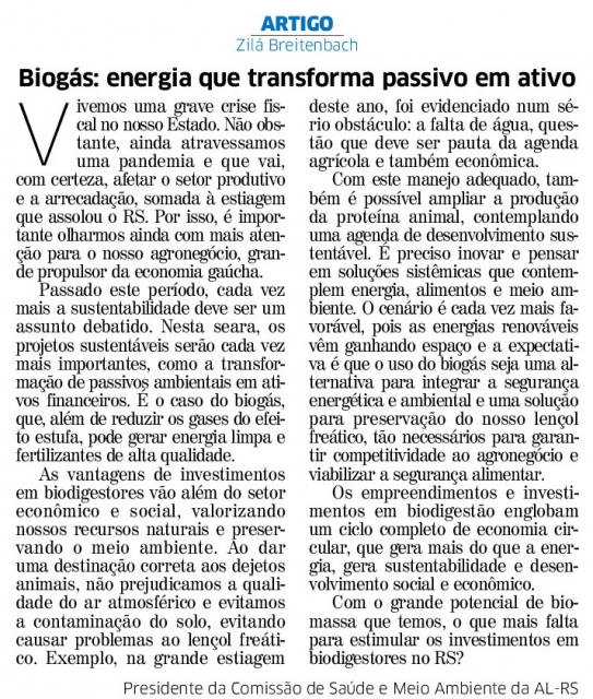 "Biogás: energia que transforma passivo em ativo" - Correio do Povo, 02/07/2020.