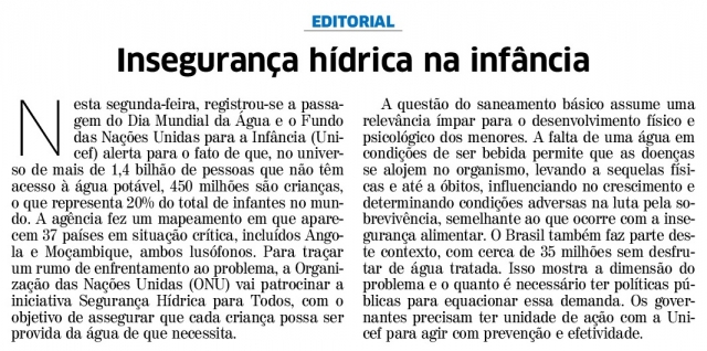 "Insegurança hídrica na infância" - Correio do Povo, 23/03/2021.