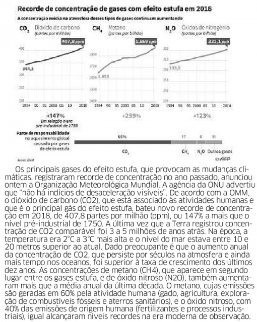 Concentração de gases do Efeito Estufa bate recorde em 2018, diz agência da ONU - Correio do Povo, 26/11/2019.